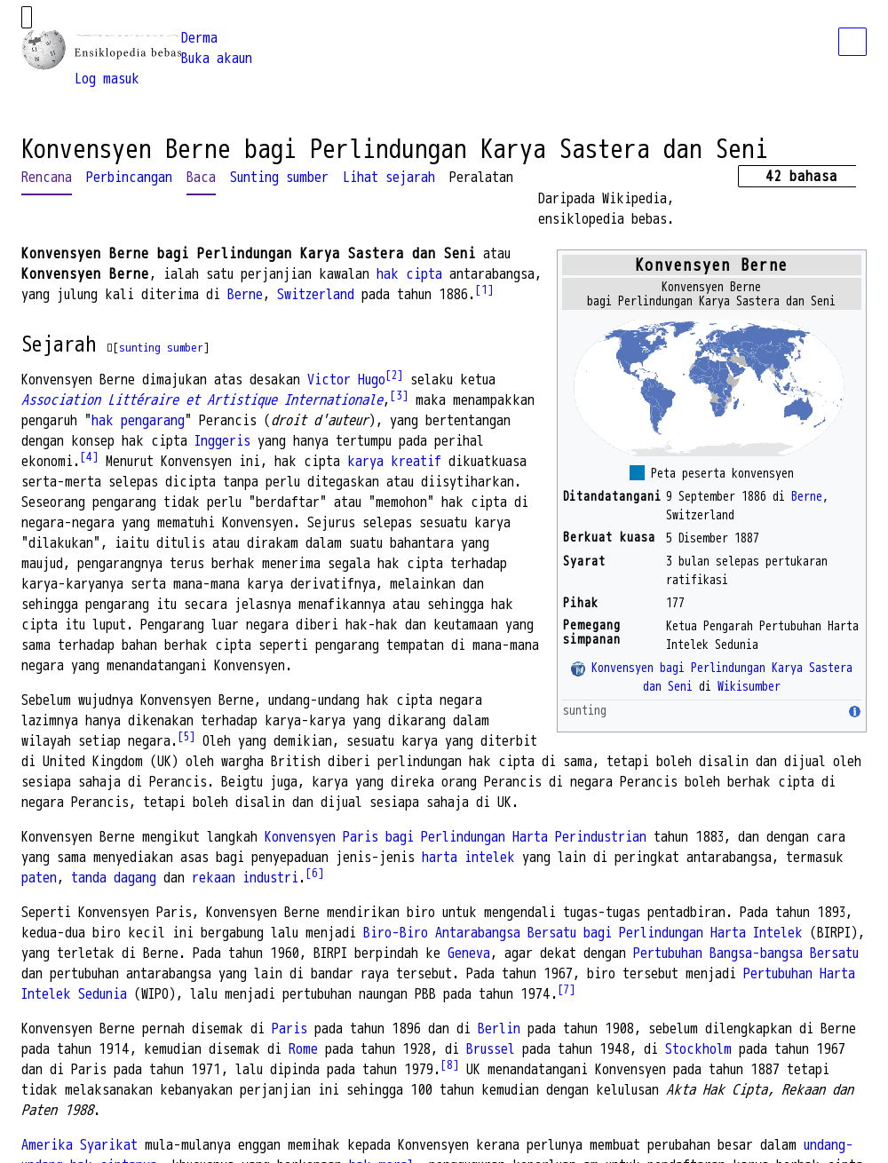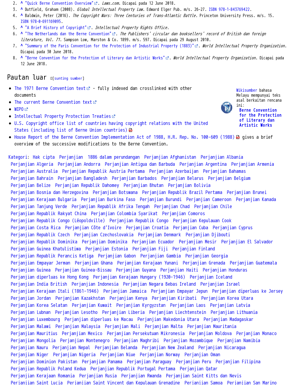 Pada April 2008, terdapat 163 buah negara yang memihak pada Konvensyen Berne.
